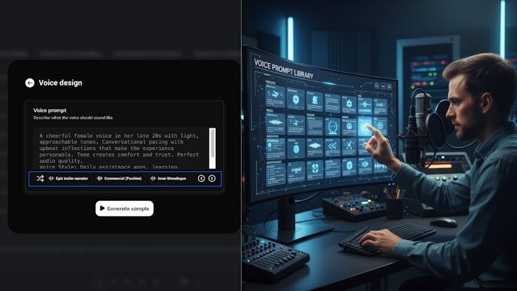 Build completely original voices from scratch with simple prompts. Deep, cinematic, quirky, warm and your imagination is the only limit.